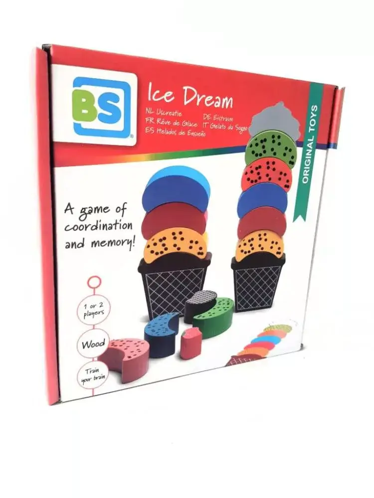 Húzz egy kártyát, és a rajta lévő kép szerint pakold egymásra a különböző színű gombócokat. Az nyer, aki először meg tudja építeni a fagyiját anélkül, hogy a gombócok lepottyannának. Ha szeretnéd, készíthetsz fagyit a kis barátodnak is. A vidám, színes gombócok garantáltan lekötik a gyerekeket. Remek ügyességi játék!