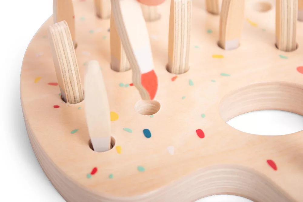 A Festékpaletta fa memóriajáték egy különleges megjelenésű, kreatív társasjáték, amely játék közben fejleszti a gyerekek memóriáját, koncentrációját és színfelismerő képességét. A paletta tele van színesre festett ecsetekkel, amelyek között a dobókocka segítségével kell megtalálni a megfelelő darabokat.