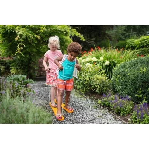 Vidám páros lépegető játék gyerekeknek, ahol a kicsik együtt, összehangolt mozgással lépkedhetnek a fogantyúk segítségével. Fejleszti a koordinációt, együttműködést és egyensúlyt, miközben garantált a szórakozás, tökéletes beltéri és kültéri játék 4 éves kortól.